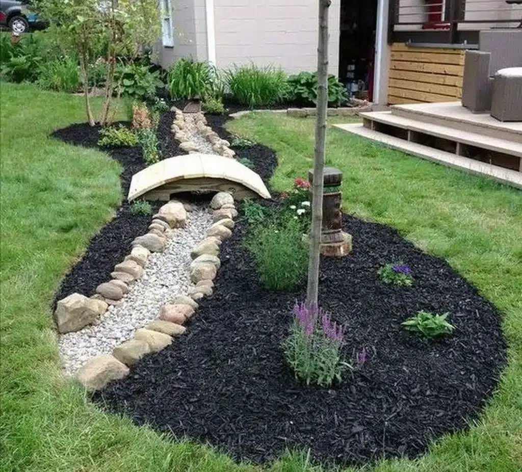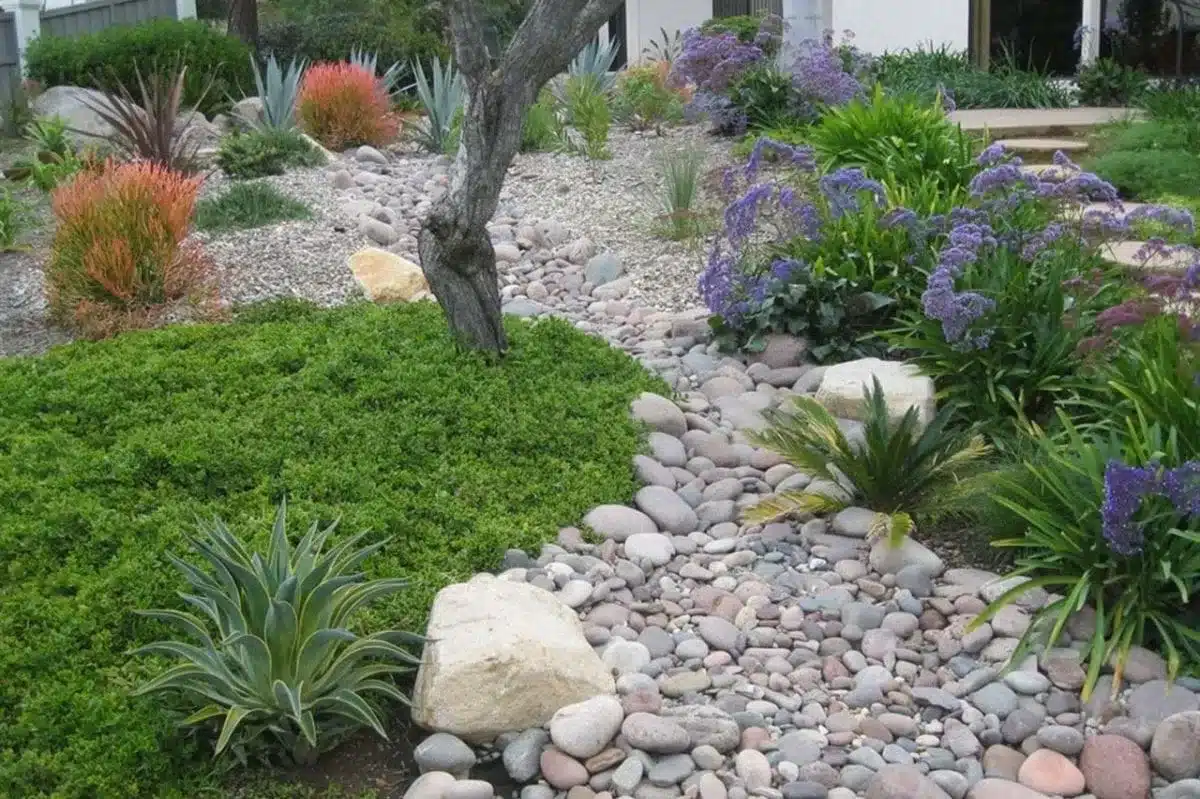 For a long-lasting dry river bed, choose high-quality river rock or stone because they can handle different weather and resist erosion well. Using landscape fabric under the stones can prevent weeds and keep the dry river bed intact.